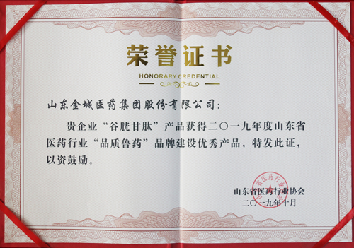 金城醫藥“谷胱甘肽”產品獲得“2019年度山東省醫藥行業協會“品質魯藥”品牌建設優秀產品。
