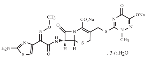 化學(xué)名稱為:(6R,7R)-7-[[(2Z)-(2-氨基噻唑-4-基)(甲氧基亞氨基)乙酰基]氨基]-3-[[(2-甲基-6-羥基-5-氧代-2,5-二氫-1,2,4-三嗪-3-基)硫基]甲基]-8-氧代-5-硫雜-1-氮雜雙環(huán)[4.2.0]辛-2-烯-2-羧酸二鈉鹽三倍半水合物。