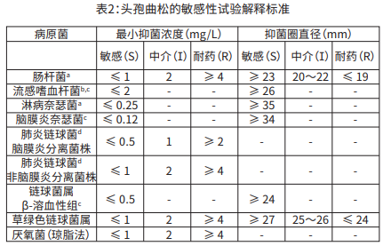 對于厭氧菌,頭孢曲松藥敏試驗(yàn)最小抑菌濃度(MIC)可通過標(biāo)準(zhǔn)瓊脂擴(kuò)散法檢測。獲得的最小抑菌數(shù)值應(yīng)該按表2中的標(biāo)準(zhǔn)進(jìn)行判定。