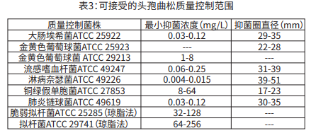 標(biāo)準(zhǔn)化藥敏試驗(yàn)方法需采用實(shí)驗(yàn)室對照品,以便監(jiān)測和確保藥敏試驗(yàn)中所用樣品和試劑以及試驗(yàn)操作人員技術(shù)的準(zhǔn)確度和精確度。應(yīng)提供具有表3中MIC值的頭孢曲松粉末標(biāo)準(zhǔn)品。對于使用擴(kuò)散法的30μg的頭孢曲松紙片的抑菌圈直徑標(biāo)準(zhǔn)應(yīng)該符合表3的數(shù)值。