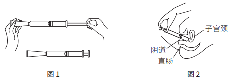 2.身體平躺后將一次性使用給藥器(已裝有適量的普羅雌烯乳膏)輕輕插入陰道,擠壓活塞。(如圖2)